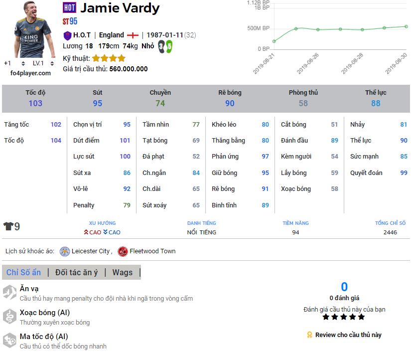 Tốc độ : đây là điểm nổi bật nhất khi sử dụng Vardy từ fo3 đến giờ. Tiền đạo người Anh có một sức rướn cực tốt trong những pha bứt tốc và đón những đường chọc khe. Thêm chỉ số ẩn ma tốc độ bổ trợ của Vardy giúp nhưng pha đi bóng của anh luôn đảm bảo được độ nhanh để thoát khỏi sự đeo bám của các hậu vệ