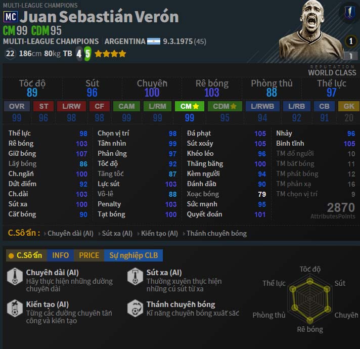 Tiền vệ người Argentina từng được coi là bản hợp đồng thất bại nhất tại sân Old Trafford dưới thời của Sir Alex. Tuy nhiên về tài năng của anh, chưa bao giờ người ta có thể phủ nhận. Là ông chủ của tuyến giữa, nhạc trưởng của Argentina và những CLB mà anh đi qua. Tiền vệ với cái đầu trọc và những cú sút xa mang thương hiệu không lẫn vào đâu được. Từng một thời là mục tiêu săn đuổi của biết bao CLB châu âu. Tuy nhiên khi bước vào tựa game FIFA Online thì Veron chưa bao giờ được coi là một cầu thủ tốt cả. Nhưng có bao giờ bạn nghĩ, do mình chưa dùng đúng anh ấy hay chưa? hãy cùng chúng tôi điểm qua những điều mà thẻ MC của Veron thể hiện trong game.