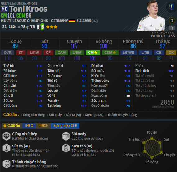 - Lương 22 là một trở ngại khá lớn trong việc đưa anh vào team, khi mà ở vị trí này người chơi đa phần chọn những cái tên khác có sức vóc hơn. Tuy nhiên nếu bạn dùng để buff team Real, Bayern Munich hay tuyển Đức, hãy chắc chắn phía sau Kroos là một CDM cao to đánh chặn tốt.