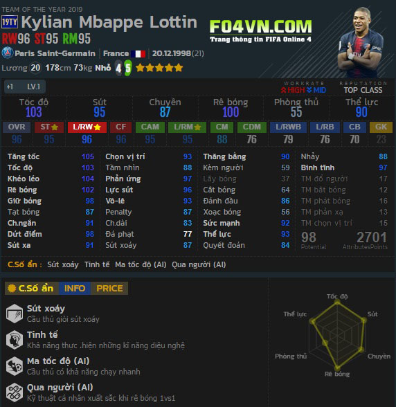 Mbappe mùa giải TOTY 19 có rất nhiều điểm mạnh từ khả năng di chuyển, rê dắt, tốc độ, khả năng dứt điểm. Vậy cụ thể ra sao, hãy cùng tìm hiểu để có cái nhìn rõ hơn về chàng tiền đạo trẻ tài năng này.