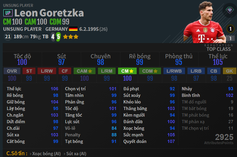 Đây chính là cầu thủ được coi là hot nhất của mùa giải UP. Tại sao ? Bởi anh chàng người Đức quá toàn diện về các mặt, chiều cao 1m89, đặc biệt là thể hình trung bình, mùa gần nhất chúng ta có một Goretzka trung bình là 20UCL và nó được ưa chuộng như thế nào các bạn cũng đã biết rồi đấy. mùa UP sẽ là một bản nâng cấp tốt hơn nhiều.