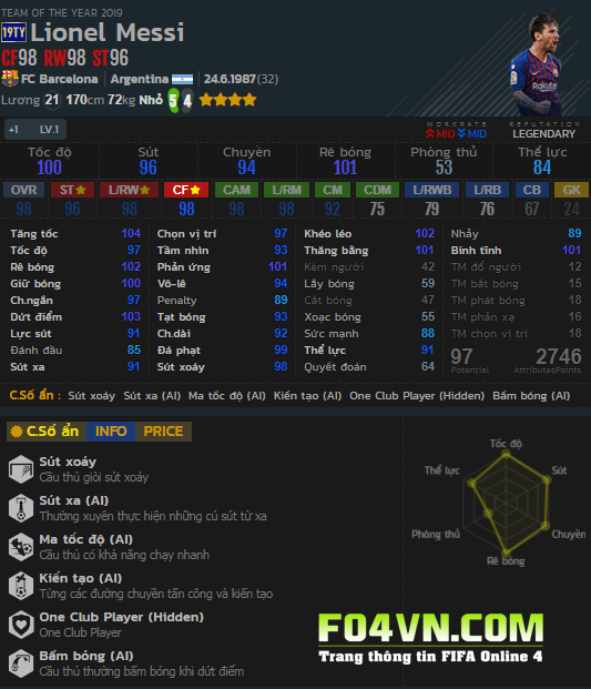 Vị trí chỉ định của Messi trong game là CF,RW và ST. Tuy nhiên bạn hoàn toàn có thể đặt Messi ở những vị trí như LW,CAM,LM,RM mà Messi vẫn hoàn thành tốt nhiệm vụ cũng như không bị hụt về chỉ số. OVR của Messi là 98 và khi lên lv5 là 102.