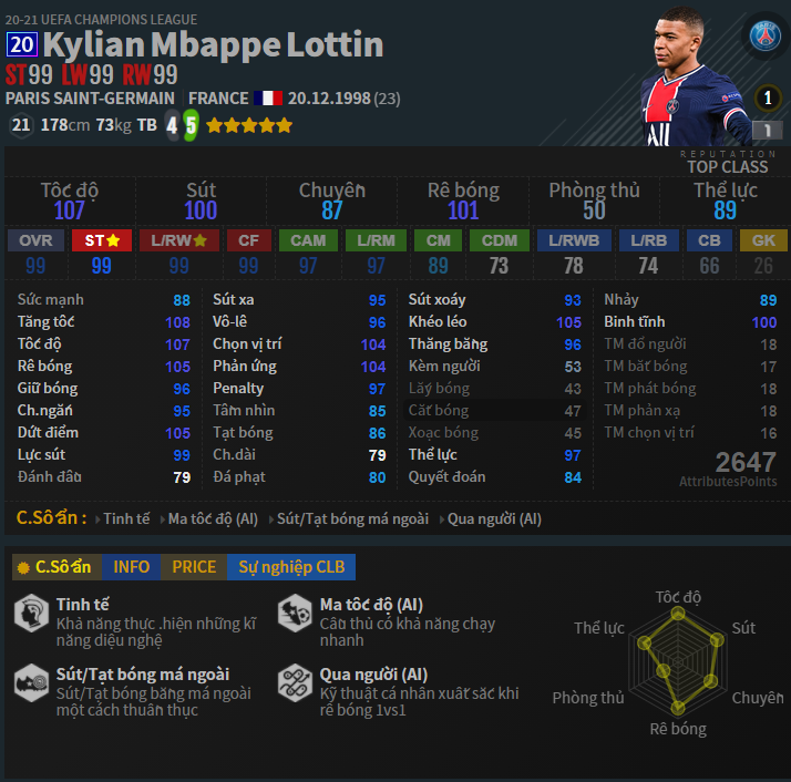 Đây là điểm có lẽ Nexon luôn giữ cho Mbappe qua mọi mùa giải, nhanh và lướt trong các tình huống dốc bóng, khi luôn có Ma tốc độ đi kèm. Không có nhiều khác biệt giữa 21TY và 20UCL