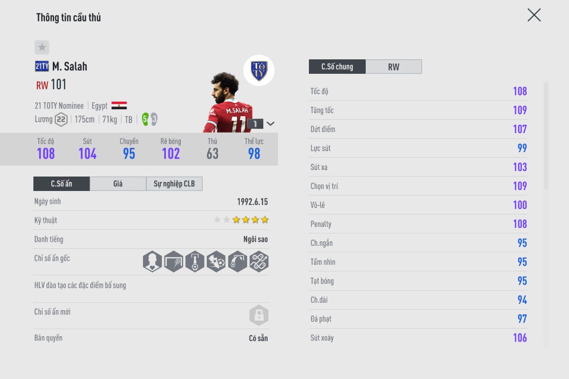 Một mùa giải thành công của Salah và Liverpool trong đấu trường quốc nội. Tuy không bảo vệ được chức vô địch C1 tuy nhiên phong độ của tiểu pharaon vẫn rất tốt. Mặc dù trong game mùa giải 21TY-N của Salah có chỉ số ngâng ngửa mùa 20TS. Tuy nhiên chúng ta sẽ cùng tìm hiểu xem liệu 21TY-N thể hiện sẽ thể hiện thế nào.