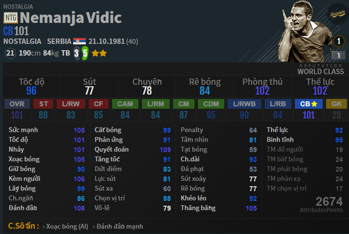 Bạn đừng bị chỉ số 101 kia đánh lừa nhé. Cái cần nhìn là chỉ số tăng tốc kia kìa. Và Vidic trong game khá chậm đấy. Mà thật ra Vidic cũng có bao giờ nhanh đâu, từ Fo3 đến nay thì Vidic được nhắc nhiều về sức mạnh chứ ít ai dùng anh vì tốc độ cả.