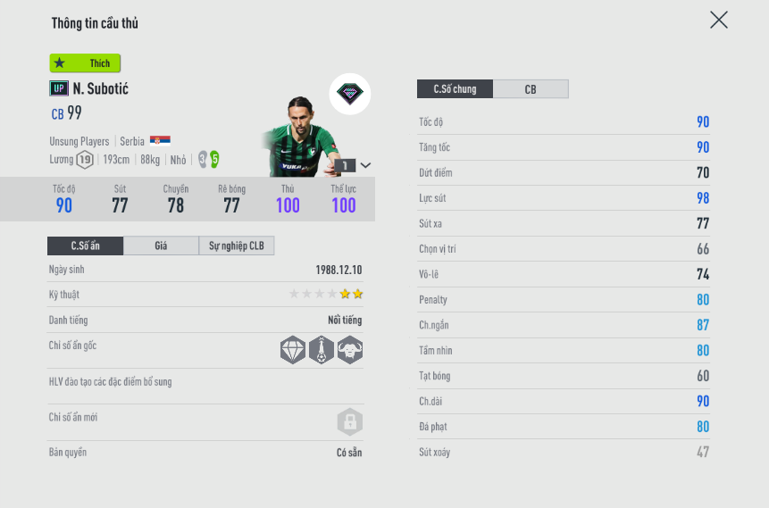 Cực khỏe, bạn sẽ cần một trung vệ như vậy ở bản game 6.0 khi mà Subotic cân mọi thể loại, kể cả Drogba. Sức mạnh trong những pha áp sát của anh như kiểu đè đầu đè cổ người ta.