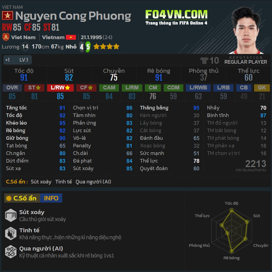 - Thể hình – thể chất: Công Phượng cao 1m70 nặng 67kg với thể hình nhỏ. Ingame Công Phượng khá nhỏ con so với các cầu thủ trong game. Cũng như Quang Hải anh có trọng tâm thấp cùng khả năng thăng bằng tốt (95) khiến anh rất khó ngã trong các tình huống tranh chấp tay đôi, việc này cũng làm khả năng kiếm Pen của anh là rất khó. Ngoài ra bạn nên có phương án thay người từ phút 60 trở đi do thể lực của Công Phượng thấp (78).