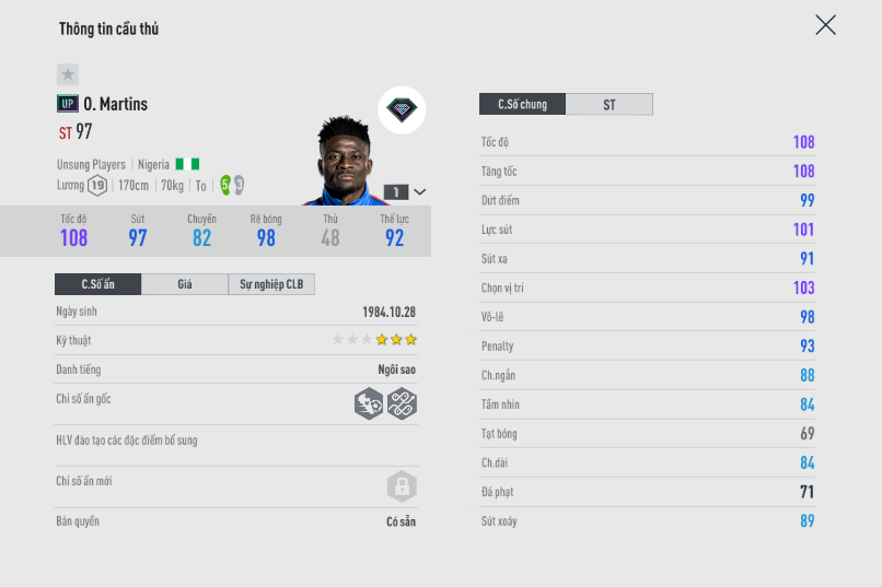 Tiền đạo từng một thời làm mưa làm gió ở Fo3, sang FO4 bị lãng quên gần như hoàn toàn, một phần cũng bởi anh chẳng có mùa nào ra hồn. Tuy nhiên với mùa giải UP thì có lẽ gió sẽ đổi chiều dành cho tiền đạo người Nigeria.