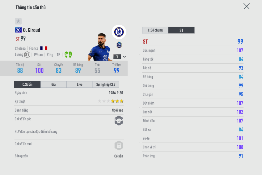 Tiền đạo cao to người Pháp đã có một vòng bảng chơi như lên đồng trong màu áo Chelsea và được Nexon ưu ai cho một chỉ số lên tới 99 trong game. Và sự khác biệt hoàn toàn với các mùa giải khác ở hai chân đều 5/5. Và với việc Chelsea bước qua vòng 1/16 không biết chừng Giroud có cơ hội để tăng chỉ số.