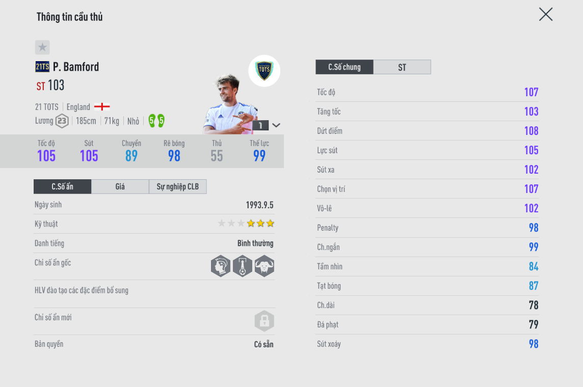 Một cái tên rất mới trong dàn cầu thủ 21TS và được đánh giá là một trong những chân sút có hiệu xuất ghi bàn khủng của mùa giải 21TS. Bamford lại ít được chú ý bởi danh tiếng của anh chàng này chỉ ở mức trung bình. Tuy nhiên với việc có một bộ chỉ số "cực ảo" thì hiện đang nổi lên như một sự lựa chọn mới cho các HLV xây dựng đội hình.