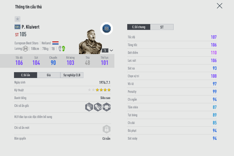 Đây vừa là điểm mạnh nhưng cũng là điểm thiếu ổn định của Kluivert khi mà chỉ số quyết đoán của anh quá thấp, đôi khi những pha tranh chấp, đè C cảm giác vẫn thiếu đi một sự chắc chắn nhất định. Có lẽ nhà sản xuất muốn chừa lại một cái gì đó cho phiên bản ICON. Bởi ngoài đời anh vốn nổi tiếng là một trong những cầu thủ cực khỏe.
