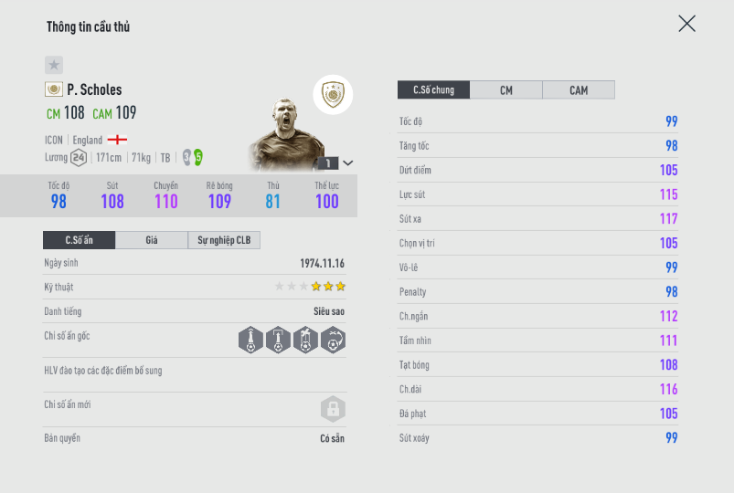 Huyền thoại của MU với khả năng chuyền bóng và sút xa đã trở thành thương hiệu. Đáng buồn là khi bước vào game thì chưa có mùa giải nào của Scholes đáp ứng được kỳ vọng của người chơi, phần nào do yếu tố về mặt thể hình của anh hơi " out meta". Vậy mùa ICON có phá vỡ được định kiến đó hay không ?
