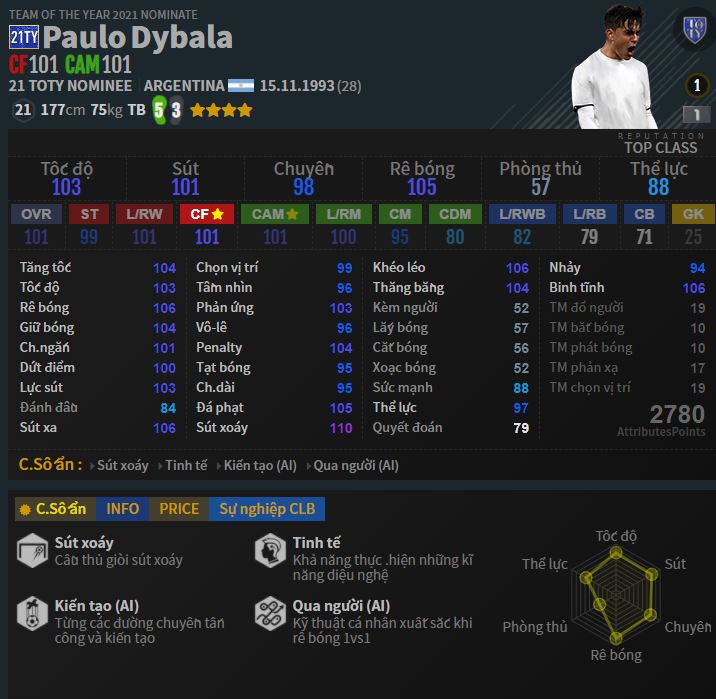 Dybala có một năm tương đối thành công trong màu áo Juventus. Mặc dù vậy trong Fo4 thì cầu thủ người Argentina thường không có được sự tin tưởng của những người chơi. Bởi sự thiếu ổn định và nửa lạc nửa mỡ của anh. Với mùa giải 21TY-N có lẽ cũng là một mùa giải không thực sự hay của Dybala. Dưới đây là những đánh giá