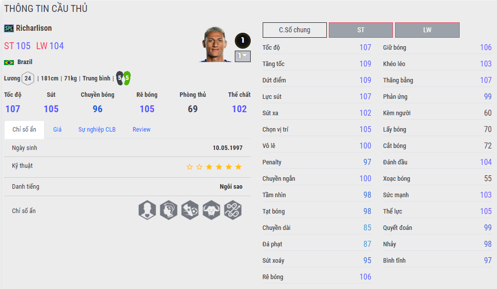 - Tốc độ : Richarlison khá nhanh và việc có ma tốc độ giúp anh chàng khá lướt khi cầm bóng, điều này bạn có thể cảm nhận khá rõ rệt và thích thú. Thú thật là tôi khá khó chịu khi cầm một cầu thủ mà không có ma tốc độ để tấn công.