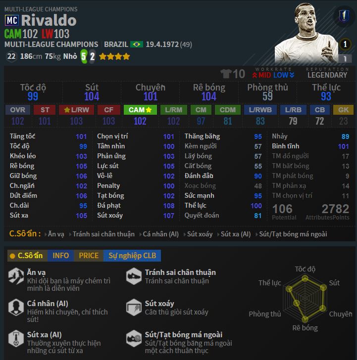 Là hạt nhân trong chức vô địch 2002 của Brazil cũng như là linh hồn một thời của Barca, Rivaldo được kỳ vọng rất nhiều khi có mặt tại Fo4. Tuy nhiên cho đến giờ qua nhiều mùa giải, anh vẫn khá mờ nhạt. Chúng ta sẽ cùng tìm hiểu xem liệu anh có khác biệt gì nhiều khi mùa giải MC anh là cầu thủ có chỉ cực cao hay không?