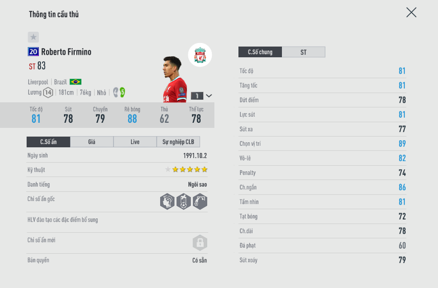 Là tiền đạo chủ lực của Liverpool trong nhiều mùa giải gần đây, là bộ 3 làm lên chức vô địch C1 của đội bóng thành phố cảng, Tuy nhiên trong game chỉ số của Firmino chưa bao giờ là một con số hoàn hảo, khi mà tốc độ và các chỉ số thể lực sức mạnh luôn ở mức trung bình.