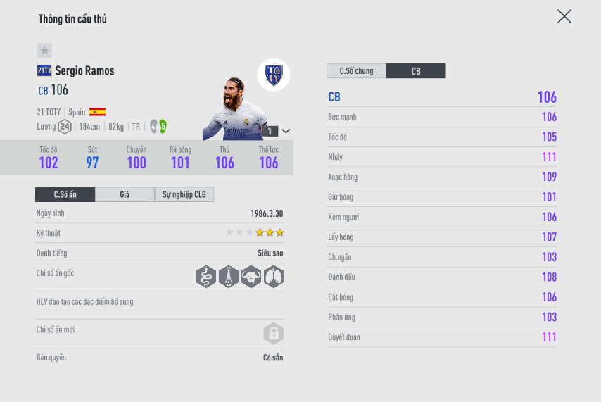 Đây là thẻ mà Ramos có chỉ số tốc độ tốt nhất và có lẽ nó đủ để bạn đeo bám được các cầu thủ tiền đạo trong game. Mặc dù tăng tốc của Ramos chưa được ổn, tuy nhiên vì anh chơi ở vị trí trung vệ khả năng đánh chặn sẽ được đề cao hơn là đua tốc với đối phương.