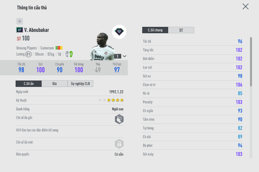 Khá hiền, thậm chí là cùn, không hiểu sao nhưng cảm giác không hề đúng với chỉ số của con số 102 chút nào. Mặc dù nhiều tình huống lao xuống đối mặt nhưng Vincent Aboubakar lại gây thất vọng khá lớn đấy.