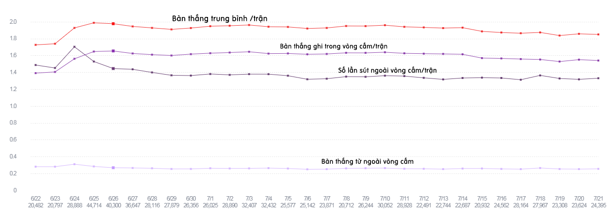 Có thể thấy trước update các game thủ Hàn sút xa tương đối ít, chỉ thực sự tăng đột biến vào ngày update để kiểm tra gameplay. Còn hiện tại thì số lần tung những cú sút ngoài vòng cấm thậm chí còn tụt thấp hơn cách đây 1 tháng. Trong khi đó thì tỷ lệ bàn thắng từ sút xa không hề giảm, giao động 0.2 bàn/trận ( quá ít )