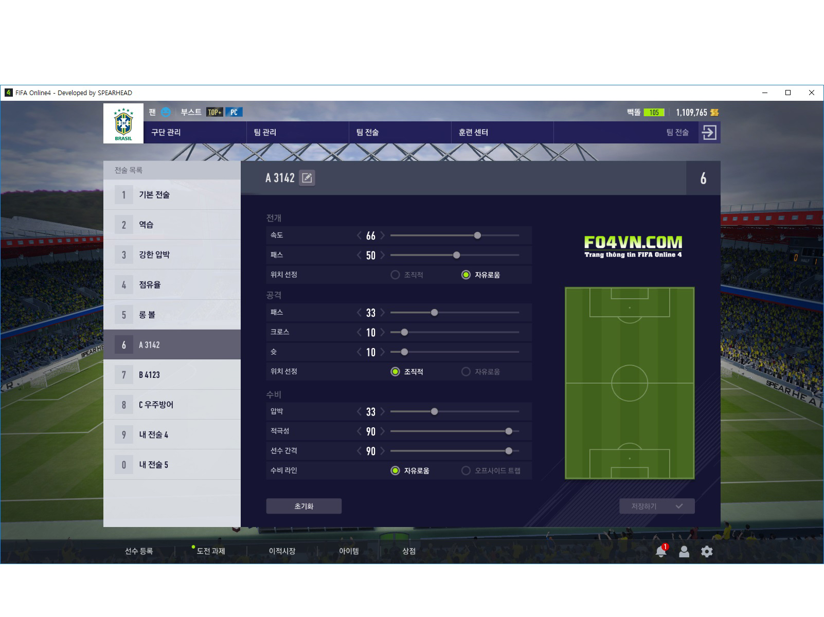 Tấn công: Chuyền 33, tạt 10. Với 1 brazil thiên về phối hợp và các cầu thủ đều k có khả năng đánh đầu tốt thì tạt mức 10 là vô cùng hợp lý. Mức chuyền 33 sẽ giúp các vị trí sát nhau hơn, dễ dàng có nhiều sự lựa chọn chuyền bóng cho các cầu thủ. Sút mức 10 sẽ khiến các cầu thủ phối hợp áp sát khung thành hơn thay vì tìm cơ hội sút xa ngoài vòng cấm. Lối chơi tấn công tổ chức sẽ hạn chế việc các cầu thủ dạt biên hay lùi sâu.