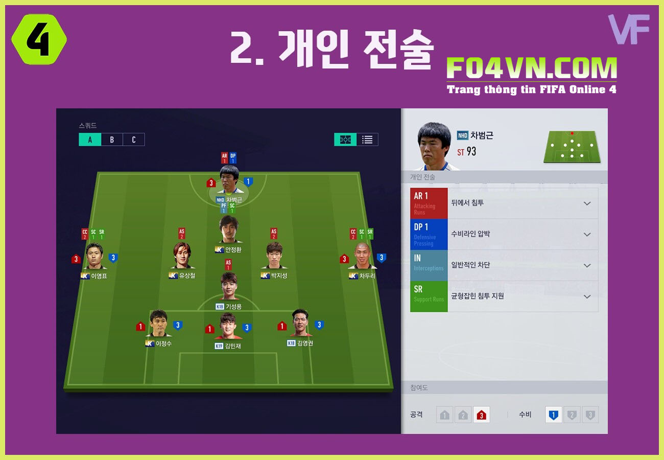 CAM : PF1 lối chơi tự do và thường xuyên ở phía trên,SC1 tham gia vào các tình huống tạt bóng tấn công. Xu hướng công thủ 2-2