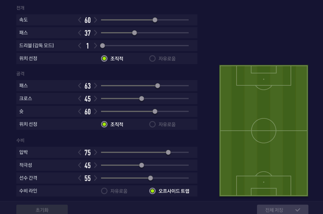 Có thể thấy là áp lực của team được đặt khá cao 75. Điều này sẽ làm cho đội hình của bạn thường có xu hướng áp sát nhanh và đá pressing ngay khi mất bóng. Nhưng hãy chú ý đó là đường phòng thủ được đặt là bẫy việt vị, nó tuy là con dao hai lưỡi nhưng lại là một biện pháp tốt trong các sơ đồ ít hậu vệ bởi nó khiến cho các cầu thủ đỡ mắc lỗi vị trí hơn,