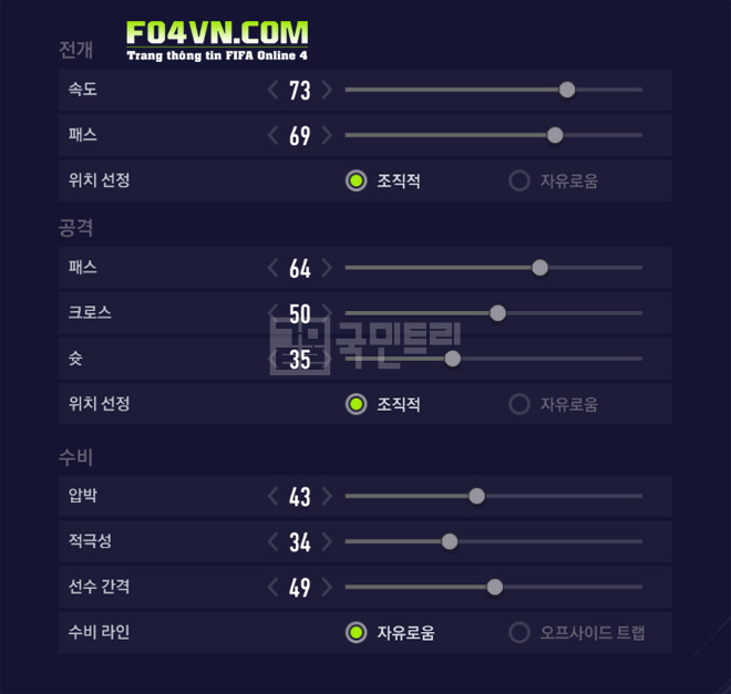 Phòng ngự: mức gây áp lực 43 và quyết đoán 34. Để hạn chế dâng cao của các vị trí phòng ngự. Và biên độ 49 để các vị trí tránh kéo quá giãn. Phòng thủ tự do để các vị trí xoay chuyển vị trí hỗ trợ lẫn nhau.