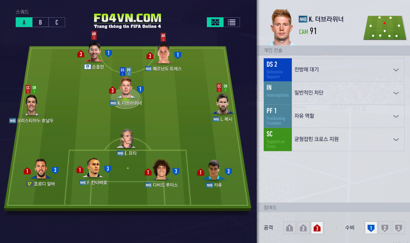 CAM: Xu hướng công thủ 3-1 để tiền vệ tấn công có thể trực tiếp tham gia cùng các tiền đạo sẵn sàng làm chân chuyền điều phối bóng cũng như trở thành kẻ săn bàn trực tiếp trước khung thành đối phương với việc trở thành cầu thủ di chuyển tự do với PF1.Và với DS2 cầu thủ của bạn sẽ lui về hỗ trợ phòng ngự cùng với CDM khi cần, giảm áp lực lên vị trí này từ tuyến tiền đạo đối phương.