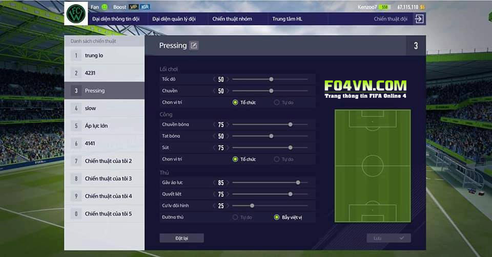Sơ đồ 4-1-2-1-2 có lối chơi chiến thuật phản công nhanh cực kì hiệu quả, ngoài ra có thể kiểm soát làm chậm nhịp độ trận đấu với lối đá tiki taka chậm. Điều cần thiết trong sơ đồ này là sự tập trung cao độ trong mỗi đường chuyền bóng để tránh những đường chuyền hỏng không đáng có dẫn đến lối nhịp tấn công cũng như di chuyển của các cầu thủ. Với mức set gây áp lực và quyết liệt ở mức rất cao thì việc pressing để cướp lại bóng khá tốt, tuy nhiên đừng quá ham lao lên quá nhiều tránh việc bị hở sườn,cho nên mình khuyến nghị các bạn nên vào trận với mức phòng ngự (nút [ và ] trên bàn phím nhé). Sơ đồ 4-1-2-1-2 cực kì mạnh khi đối đầu với các sơ đồ hay lối chơi tấn công trung lộ. Với một lực lượng dày dặn nơi tuyến giữa,việc tấn công vào không khác gì tự lao đầu vào tường.