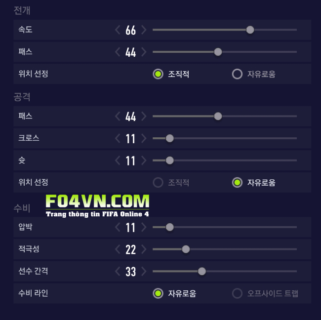Phòng thủ : gây áp lực 11 và quyết đoán 22 để các cầu thủ hạn chế áp sát gây áp lực, thay vào đó là bình tĩnh phòng ngự, lên xuống lấy bóng cẩn thận. cùng biên độ 33 để các vị trí bó sát vào trung lộ, tạo nên bức tường dày gây khó khăn cho đối thủ trong việc tấn công và xâm nhập.