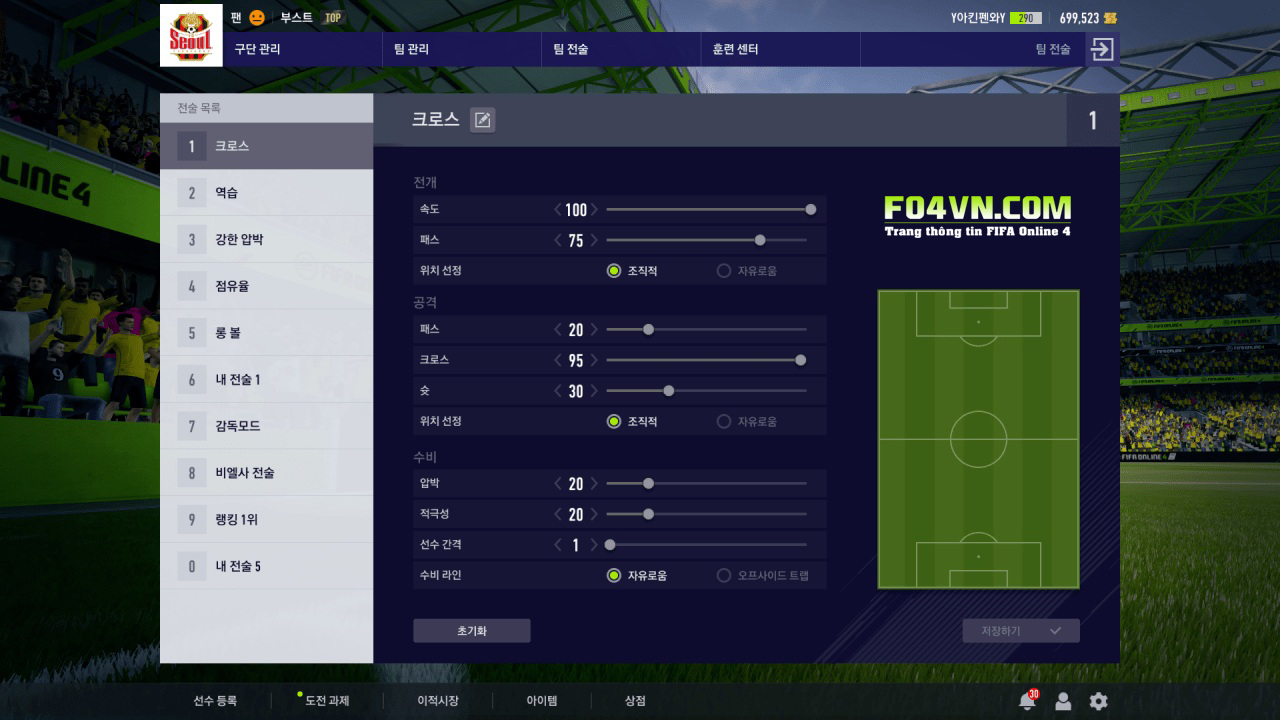 Tổng quát : tốc độ chơi 100 cùng chuyền 75 giúp kéo giãn đội hình di chuyển và những pha băng lên trở nên nhanh chóng hơn. Lối chơi tổ chức sẽ hạn chế được việc các tiền đạo dạt biên khi tấn công.
