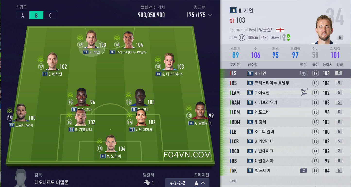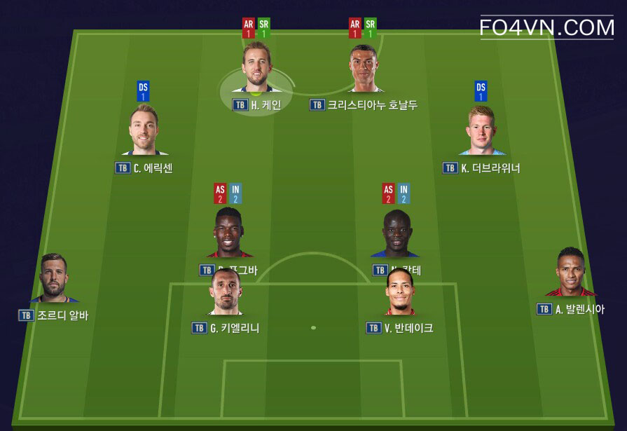 Sơ đồ sử dụng là sơ đồ 4-2-2-2 để cân bằng những vị trí trên sân. Hàng tiền đạo sẽ là sự góp mặt của Kane và Ronaldo. Ronaldo mùa TB không phải dạng cầu thủ có thể hình tốt và khỏe như những mùa giải khác nhưng anh lại có tốc độ cực kì tốt và khả năng di chuyển mau lẹ. Kane TB cũng là một trong những tiền đạo mục tiêu đáng dùng, khả năng tấn công tốt và dứt điểm cũng rất khét.