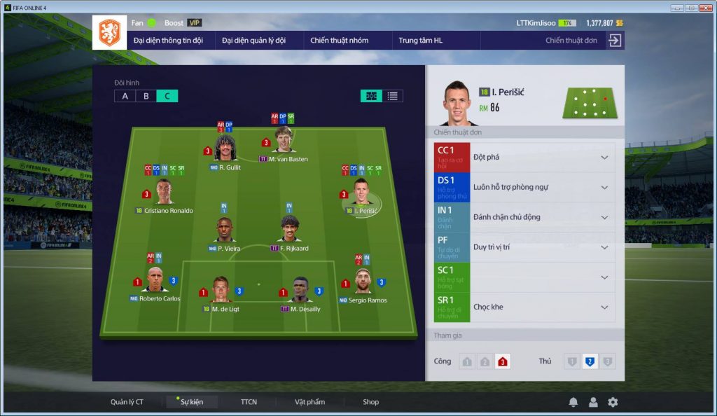 - LM và RM để CC1 đột phá SR1 chọc khe giúp những tiền vệ này có nhiệm vụ xuyên phá 2 cánh của đối thủ và ghi bàn. Do 2 người cùng có thể hình nên để DS1 luôn hỗ trợ phòng ngự + SC1 xâm nhập vòng cấm trong những pha cánh kia tạt bóng vào. IN1 giúp 2 tiền vệ pressing đc 2 cánh của đối thủ