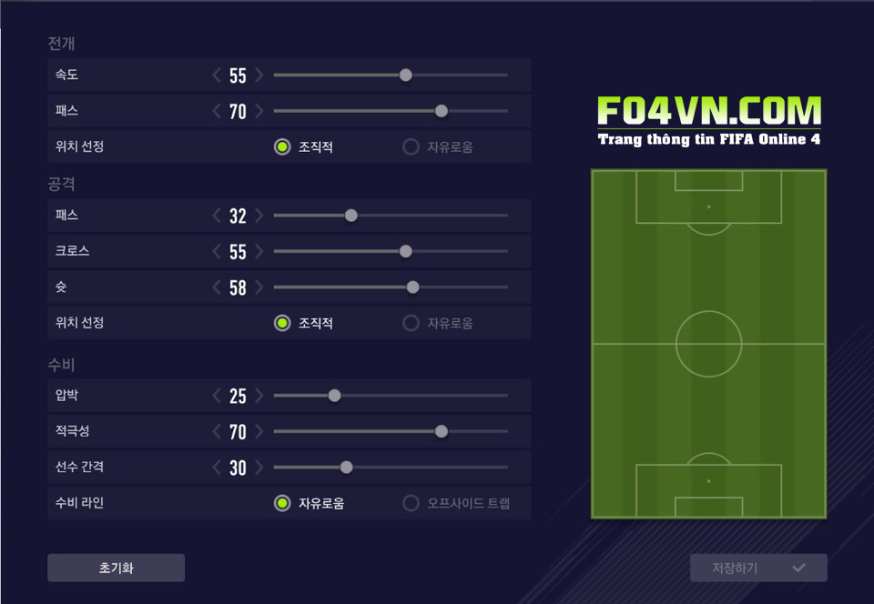 Tốc độ chơi ở mức trung bình, cự li đội hình kéo giãn nhằm kiểm soát thế trận tốt hơn. Những thiết lập tấn công không vượt quá mức trung bình phù hợp cho những ai có lối đá tấn công chậm, chắc bóng. Xu hướng chơi cũng như xu hướng tấn công có tổ chức, tránh xáo trộn đội hình thi đấu trên sân.