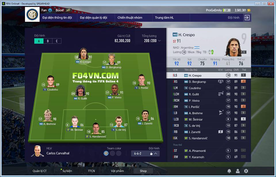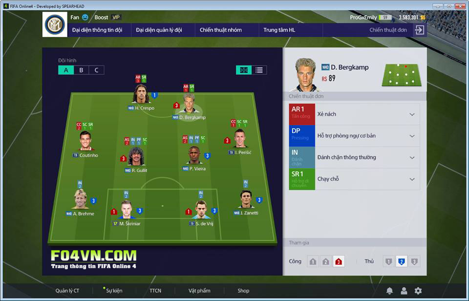 Chọn cầu thủ - Tiền đạo : ưu tiên 1 tiền đạo có tốc độ tốt, dẻo, chạy chỗ khôn, sút tốt đá cặp với 1 tiền đạo cao to có khả năng sử dụng cả chân lẫn đầu - Tiền vệ cánh : 2 cầu thủ cần có thể lực, tốc độ ổn và khả năng tạt bóng tốt - Tiền vệ trung tâm : Đây là 2 mắt xích quan trọng nhất trong sơ đồ này. 2 tiền vệ trung tâm cần phải cơ động, lên công về thủ liên tục và kịp thời. - Hậu vệ cánh : tùy các bạn chọn - Trung vệ : Nên chọn 2 trung vệ toàn diện, xu hướng thủ 3, giữ vị trí tốt vì trong sơ đồ này không có vị trí tiền vệ đánh chặn