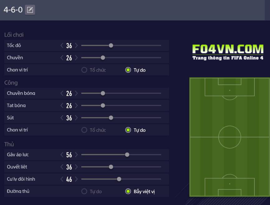 Bước vào game FO4, Với sơ đồ 4-6-0, ae sẽ phòng thủ cực kỳ chắc chắc vì các cầu thủ sẽ có xu hướng thi đấu gần nhau và cầm bóng rất nhiều.