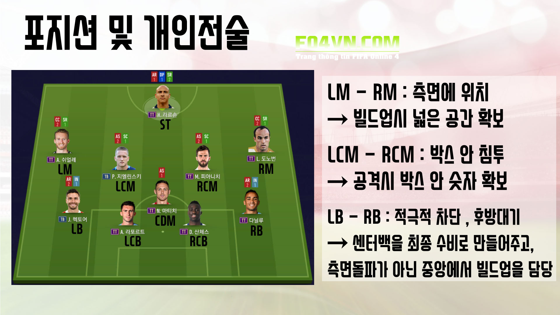 Sơ đồ sắp xếp dựa theo sơ đồ 4-1-4-1 thông thường. Tuy nhiên để có thể tối đa hóa sức mạnh cho đội hình bạn cần lựa chọn những cầu thủ phù hợp cho từng vị trí khác nhau.