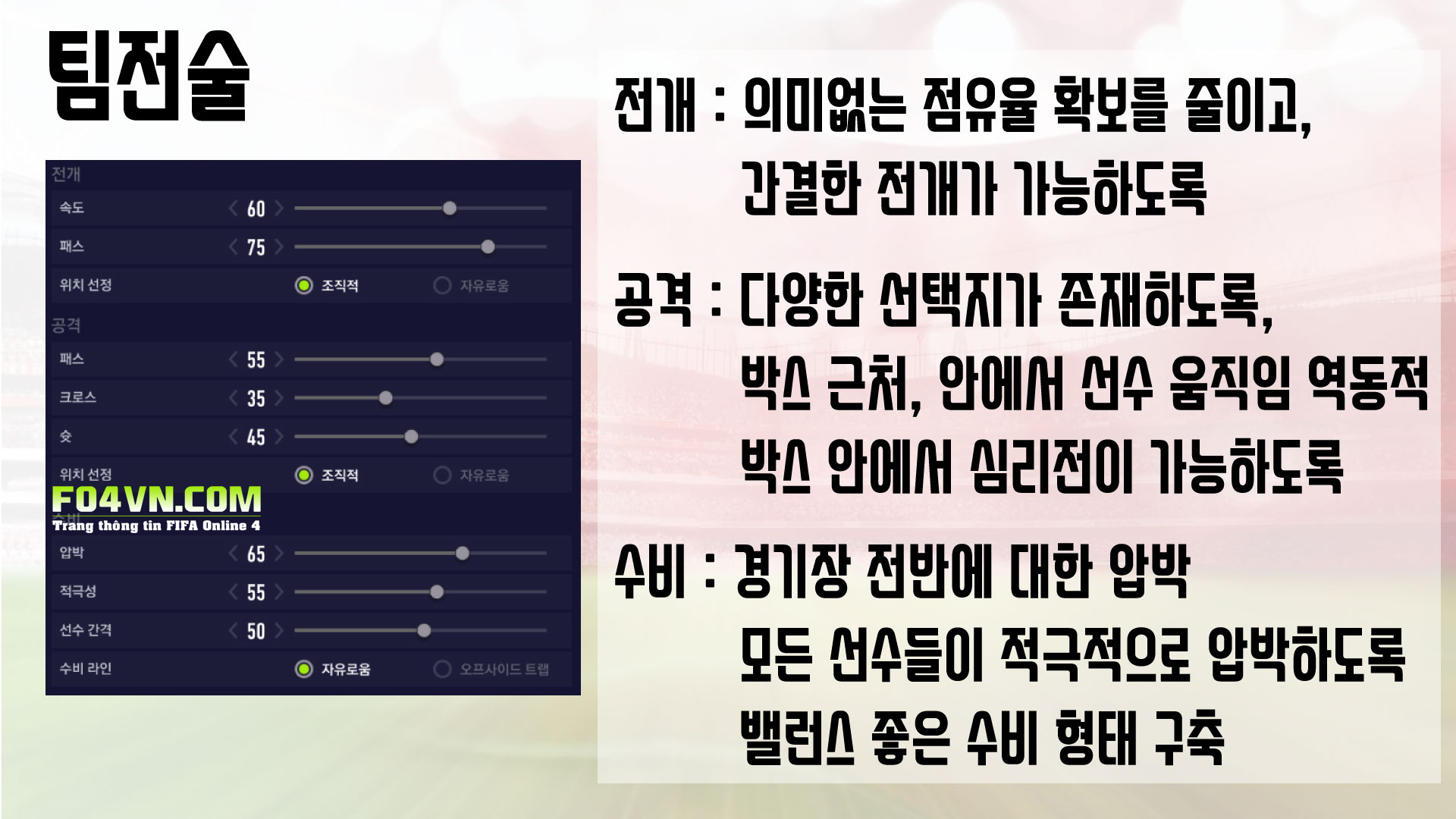 Tổng quát : Tốc độ 60 cùng chuyền bóng 75 để lối chơi tấn công được nhanh và linh hoạt cả về công lẫn thủ. Cài đặt tổ chức để tránh xáo trộn vị trí.