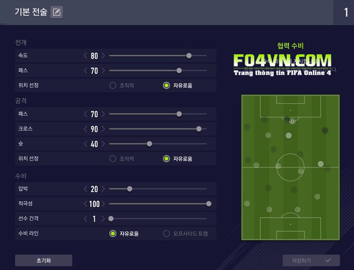 Phòng ngự : Gây áp lực ở mức 20 cùng với đó quyết đoán 100 khiến cho những tình huống vào bóng trở nên nhanh và rát nhằm áp đặt lối chơi lên đối phương. Biên độ 1 nhằm kéo co cụm 3 trung vệ chắn trước khung thành. Phòng ngự tự do để các vị trí bổ trợ cho nhau khi cần thiết.