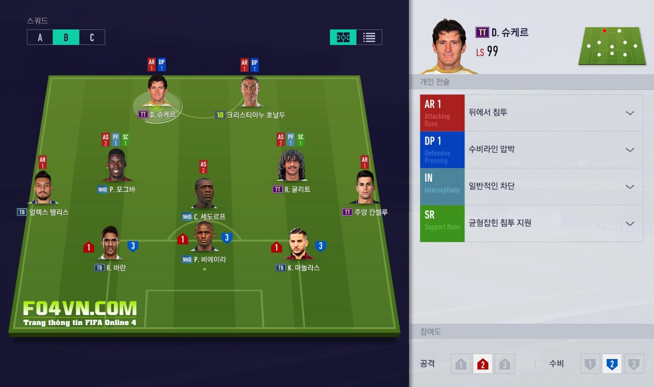 RS,LS : AR1 di chuyển xẻ nách đối thủ, cùng với DP1 giúp các tiền đạo chủ động pressing hàng phòng ngự của đối phương. Xu hướng chơi cân bằng