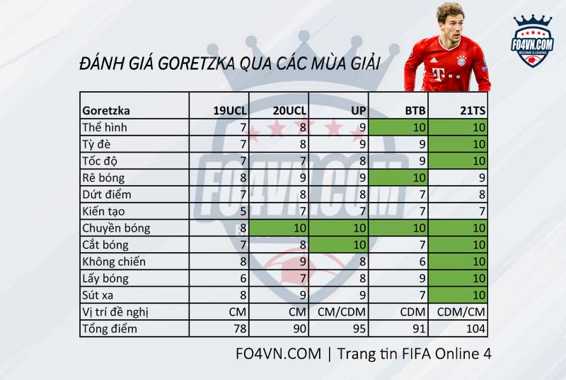 Một trong nhưng cầu thủ được rất nhiều người ưa dùng bởi anh quá toàn diện thậm chí còn ngang ngửa với các con hàng quốc dân trong game. Goretzka không chỉ có thể hình tốt mà anh còn có tốc độ rất tốt cho meta game hiện nay