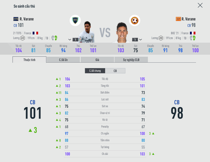 Một trong những cái tên đáng chú ý nhất mùa giải BOE21 chính là Varane khi trung vệ này đang nổi lên như một hiện tượng mới. Vậy liệu BOE 21 so với các mùa giải trước đó thì có hiệu quả cao hơn không. Mời các bạn so sánh với mùa giải gần nhất của anh chàng này là 21TY