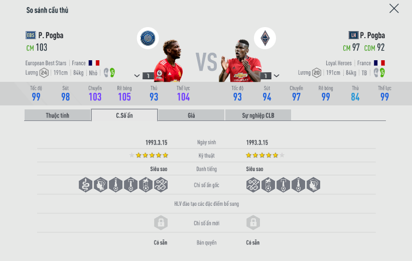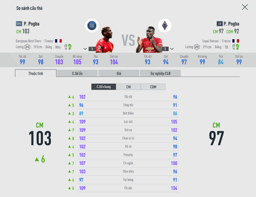 Việc các bạn có thể nhận ra ngay tức khắc đó là thể hình mùa EBS chỉ là nhỏ, trong khi LH có được thể trạng trung bình. Chỉ số sức mạnh cũng như quyết đoán LH rất tốt. Điều này phần nào tạo ra phần thể hiện trên sân của Pogba LH về mặt va chạm, tranh chấp tốt hơn hẳn. Đặc biệt là khâu không chiến.