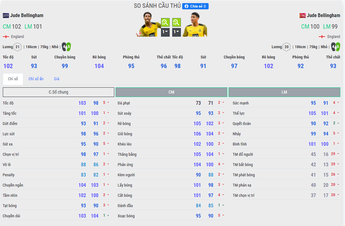 Các chỉ số thành phần của 21NG chắc chắn là sẽ thấp hơn so với 22TY. Tuy nhiên việc Ovr thấp hơn 2 chỉ số là điều hoàn toàn dễ hiểu !!! chúng ta sẽ đi vào các tiêu chí đánh giá