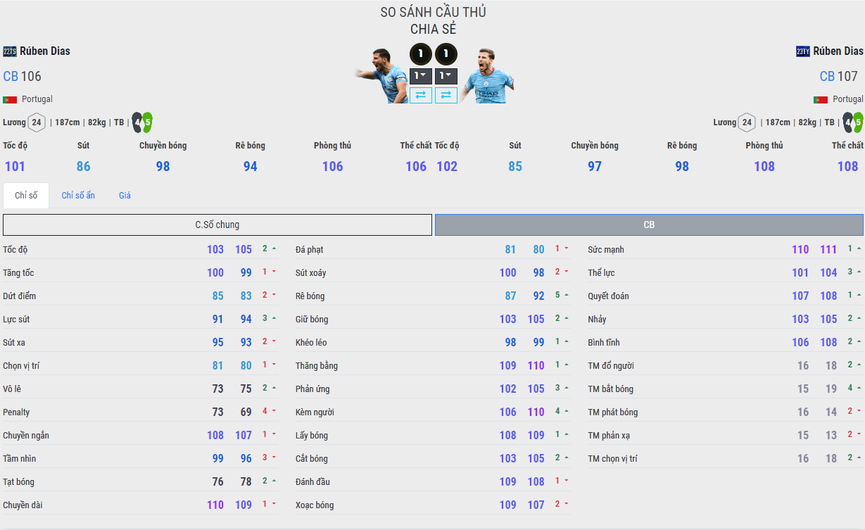 Mùa giải 22TS của Ruben Dias được rất nhiều người ưa dùng bởi mức lương tương đối phù hợp và chất lượng đem lại là rất cao. Tuy vậy sự xuất hiện của 23TY với chỉ số gần như tương đương, thậm chí chỉ số phòng ngự còn cao hơn 22TS, mặc dù chỉ số ẩn ít đi 2 skill nhưng có vẻ như hiệu ứng mùa mới đang được thể hiện khá rõ trên 23TY.