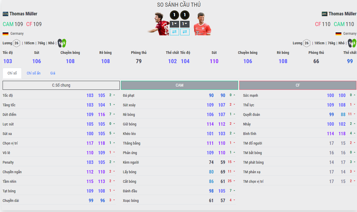 Hai mùa giải có thể coi là cao nhất hiện tại của Thomas Muller cho đến thời điểm hiện tại. Có cùng mức lương nhưng chỉ số lại có sự chênh lệch, tuy nhiên có một điểm khá hài hước là Muller của năm 2014 và năm 2022 dường như chẳng khác nhau gì ở chỉ số ẩn cả. Trong khi đó các mùa giải khác gần đây của Muller lại kha khá các chỉ số ẩn khá thú vị.