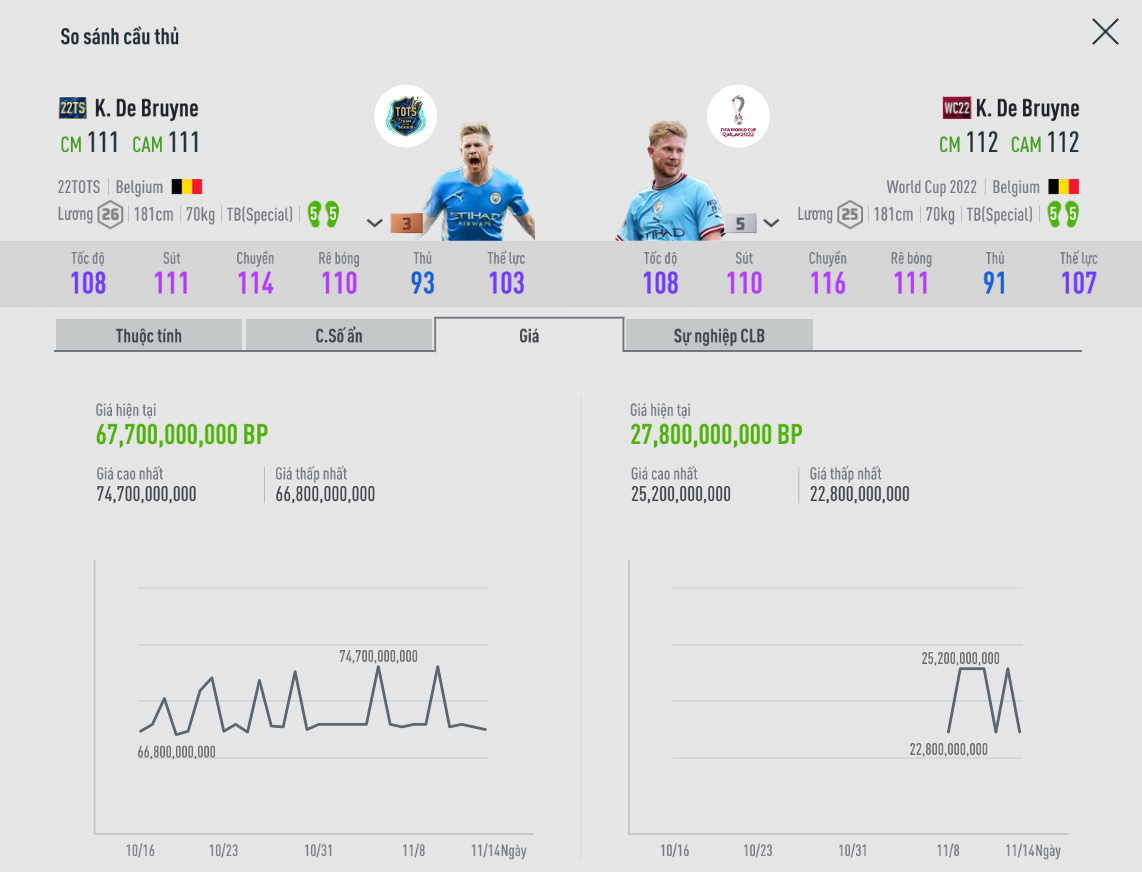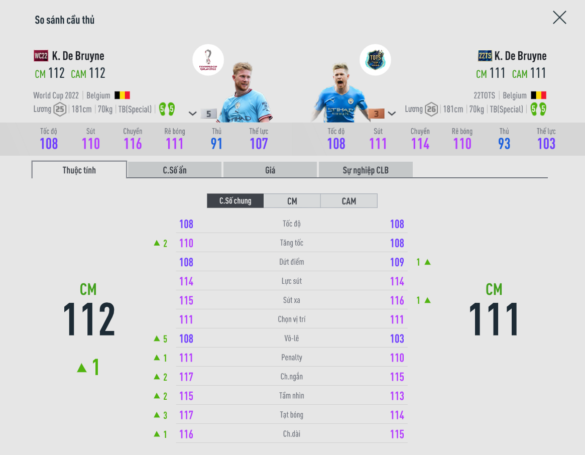 Trong bài viết này Fo4vn xin được gửi tới các bạn sự so sánh giữa De Bruyne 22TS và mùa giải 22WC +5 của chính cầu thủ này. Xin được nhắc lại là mùa giải 22TS có độ uy tín cực cao và nếu như bạn không sở hữu được WC22+5 thì nên quay về sử dụng 22TS ở mức thẻ +1 +3 nhé.