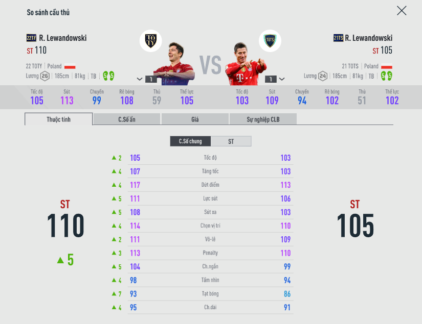 Mùa giải mới cao nhất của Lewandowski lên tới chỉ số 110 và mức lương 26 như một ICON. Liệu nó có xứng đáng với mức lương và số tiền mà các HLV bỏ ra để sở hữu hay không ? hãy cùng so sánh với mùa giải 21TS của siêu tiền đạo này.