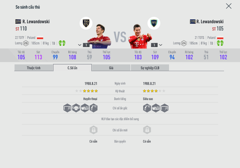 Nếu như bạn đã hài lòng với 21TS ở khâu dứt điểm thì mùa giải 22TY sẽ đưa bạn lên một tầm cao mới là thỏa mãn, với sự đa dạng được " cơ nới hóa" rộng hơn khi khả năng ZD, DD được buff cực mạnh. Rõ ràng đây là phiên bản sút kinh nhất của tiền đạo người Ba Lan cho tới thời điểm hiện tại.