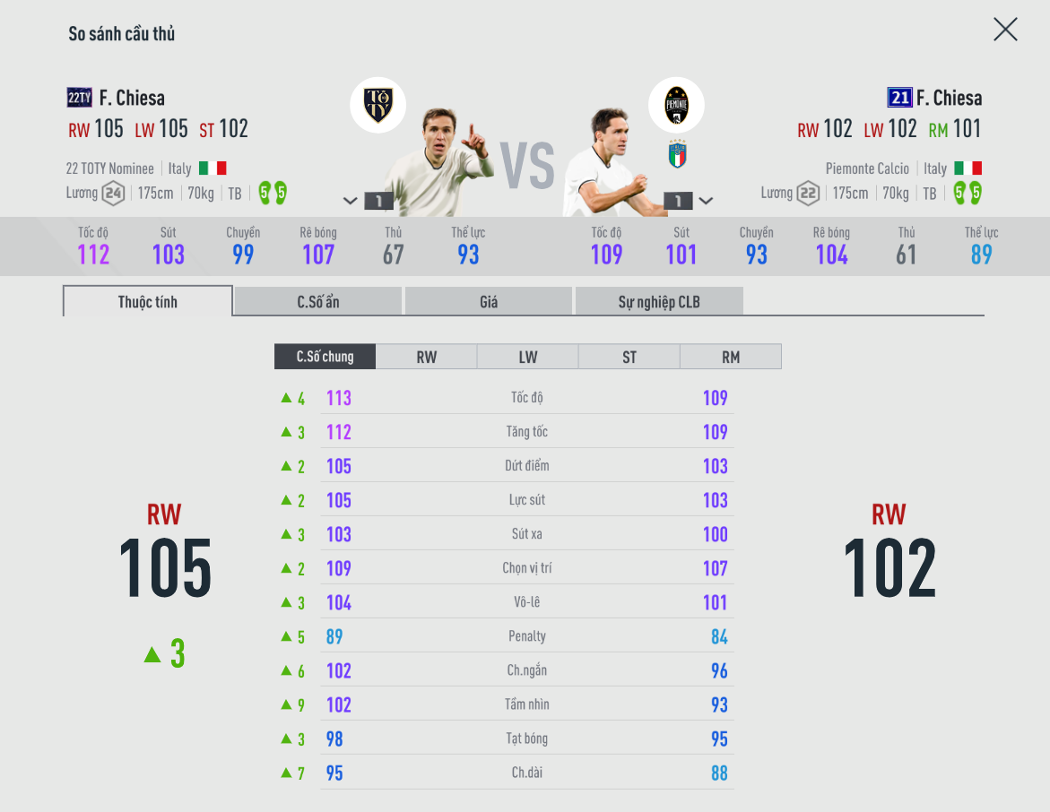 Chênh lệch nhau 2 mức lương, nhưng bù lại Ovr của 21UCL chỉ là 102 và hoàn toàn có thể nâng cấp lên + 5 dễ dàng hơn so với 22TY. Thể hình và các yếu tố hình thế không hề có điểm khác biệt cho hai mùa giải.